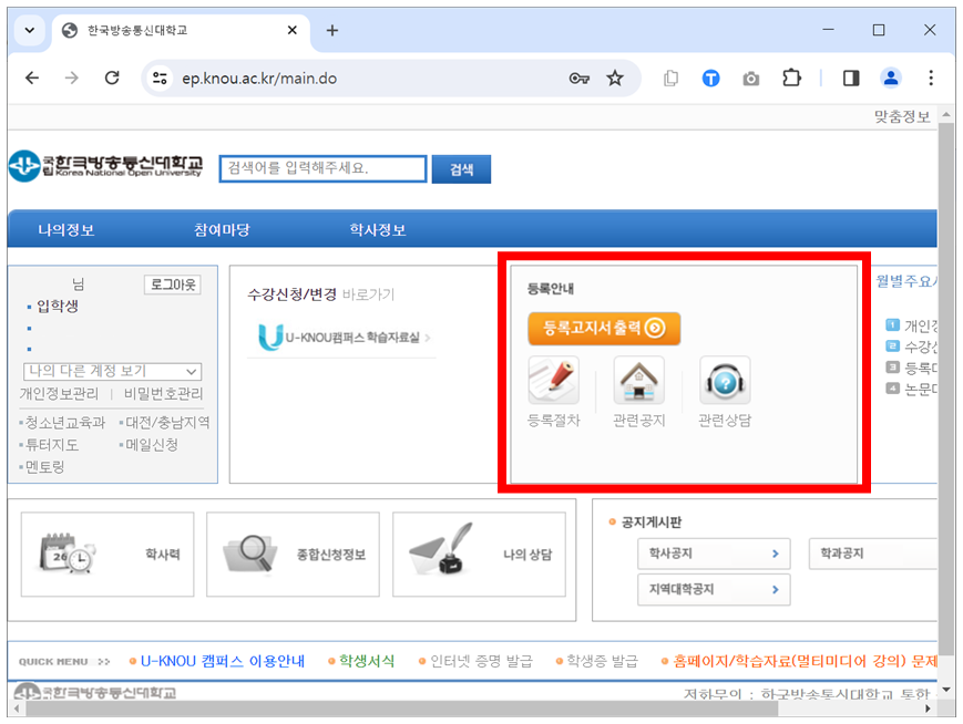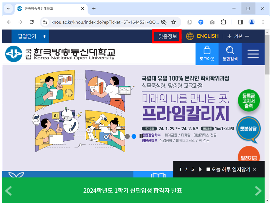 로그인이 되어 있을 경우 방송통신대학교 홈페이지에서 맞춤 정보 페이지로 이동할 수 있는 방법입니다.