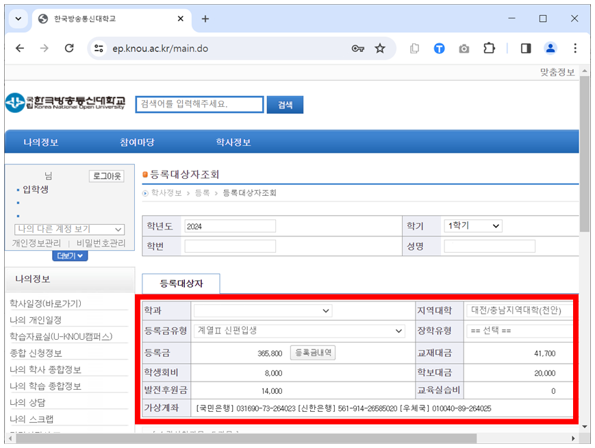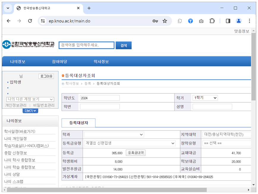한국방송통신대학교 2024학년도 1학기 등록금이 납부되었습니다.
