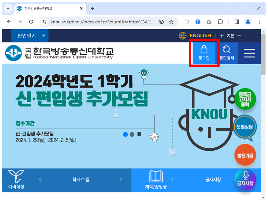 한국방송통신대학교 홈페이지에 접속합니다.